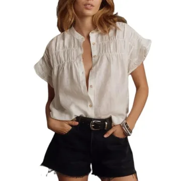 Women Button Down Shirt Short Cap Sleeve V Neck Collared Blouse Tops Loose Fit Smocked Tee Casual Summer Tops (White,X-Large)