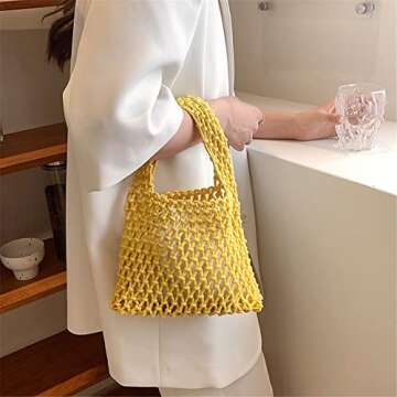 Show moreElevate your summer style with the exquisite Women Clutch Purse Woven Bag. This charming handbag, expertly crafted from handwoven cotton crochet, showcases a unique and vibrant yellow hue that embodies the spirit of sunny days. Its portable net design not only makes it a fashionable accessory but also ensures practicality for all your needs. Perfect for beach outings, casual lunches, or evening strolls, this small summer fishnet bucket bag merges function and flair seamlessly, giving you an eye-catching addition to your wardrobe.