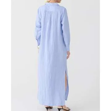 Women Cotton Linen Shirt Dress Casual Split Maxi Dresses Long Kimonos Cardigans Beach Cover Up Sundress Blue