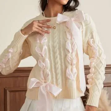 Women Cute Bow Sweater Long Sleeve Bow Front Knitted Pullover Ribbon Lace Up Cable Jumper Knitwear Going Out Top