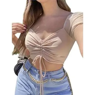 Women Cute Corset Short Sleeve Crop Top Cinched Drawstring Deep V Neck Tube Top Going Out Shirt Light Coral S