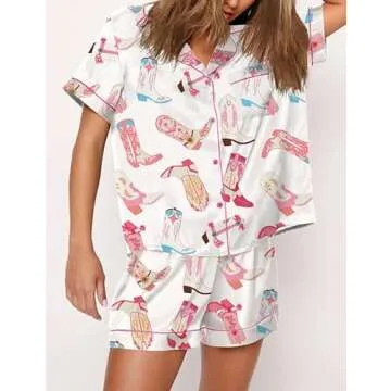 Show more The ultimate blend of comfort and style, this women’s two-piece pajama set embraces a cute design that is hard to resist. Crafted by a trusted brand, it features long sleeves, a chic lapel collar, and a charming front button closure. The playful cartoon and fruit prints add a delightful touch to your loungewear, making you feel stylish even in the comfort of your home. The matching high waist shorts complete the look, providing an elegant and cozy fit.