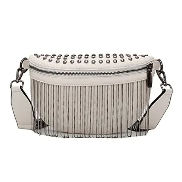Show moreElevate your style with our exquisite Women's Leather Fanny Pack, designed to make a statement wherever you go. Crafted from top-quality PU leather with a soft polyester lining, this bag combines durability with elegance. The surface is beautifully decorated with rivets and sparkly rhinestone tassels, exuding a punk style that's both unique and fashionable. Its waterproof feature ensures your belongings stay safe, making it not just stylish but practical too.