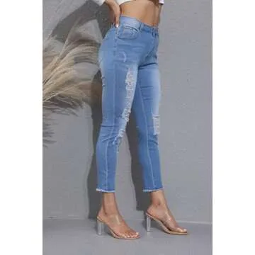 Show moreStep up your style game with our Women High Waist Skinny Stretch Ripped Jeans. Crafted from premium quality denim, these light blue cropped jeans effortlessly blend comfort and fashion. The high waist design not only flatters your figure but also provides the perfect fit that hugs your curves in all the right places. Featuring strategic Rip and Destroy detailing at the knees, these jeans add an edgy flair to your wardrobe, making them a versatile choice for any occasion.