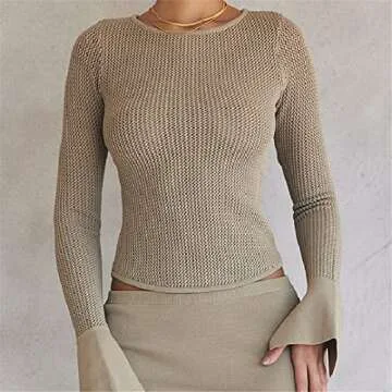 Women Hollow Out Knit Casual T-Shirts Solid Ribbed Slim Fit Pullovers Tops Streetwear