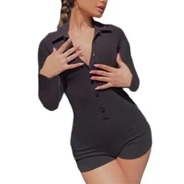 Women Jumpsuit Solid Color Short Sleeve Combi Bodysuits Bodycon Sexy Romper Overalls Shorts Y2K Playsuit (LS Black, M)