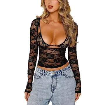 Women Lace Long Sleeve Shirt Top Y2K Slim Fit Crop Top Sexy Lace Low Cut Top Tee Club Streetwear