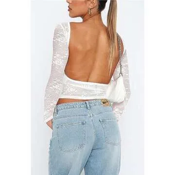 Women Lace Sheer Crop Top Long Sleeve Sexy See Through T-Shirt Slim Fitted Mesh Patchwork Cropped Blouse Streetwear