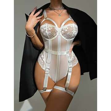 Women One Piece Lingerie With Garter Belt Strappy Teddy with Suspender Naughty Lace Bodysuit (White, M)