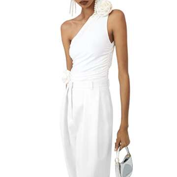 The sleeveless design, complemented by a chic ruched detail, transforms this tank top into an instant attention-grabber, making you stand out at any event. The fashionable 3D rosette embellishment adds a touch of elegance and uniqueness, turning what could be a regular outfit into a captivating statement piece you'll love to wear.