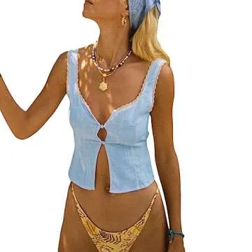 Women Open Front Sleeveless Tank Top Lace Trim Button Crop Tops Summer Sexy Slim Fit Back Tie Up Vest Streetwear (Blue, L)