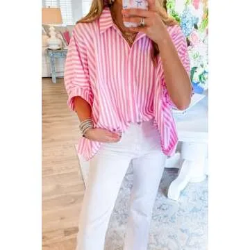 Show moreIntroducing the Women Pink 2025 Summer Stripe Dolman Sleeve V Neck Oversize Shirt Tops - an exquisite blend of comfort and style perfect for any summer occasion. Crafted from 100% cotton, this short-sleeve blouse is not only soft to the touch but designed with an airy feel to keep you cool during those hot summer days. The oversized fit and elegant collared design ensure a charming silhouette that flatters any figure. Pair it with your favorite jeans, trousers, or even leggings for a casual yet trendy look. It’s versatile enough to transition from a casual day out to an evening gathering with ease.