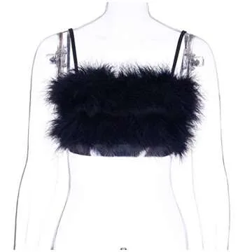 Women Rave Festival Feather Crop Tops Faux Fur Spaghetti Straps Tube Top for Concert Club Party Black