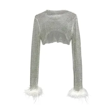 Show moreIntroducing the stunning **Women Rhinestone Crystal Crop Top** with feather cuffs – a dazzling addition to your wardrobe that is sure to turn heads! Crafted from a unique mesh fabric adorned with sparkling rhinestones, this long-sleeved crop top effortlessly combines glamour and sexiness for an eye-catching look at any event. With its delicate, sheer design and lightweight construction, it’s perfect for layering over your favorite bra or camisole, giving you versatility and style without compromising comfort. Whether you’re gearing up for a night out at a club or attending a glamorous party, this top promises to enhance your silhouette and boost your confidence.
