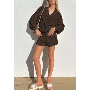 Show moreElevate your loungewear collection with the Women's 2023 Fall Casual Cable Knit Sweater Sets. This stylish and cozy 2-piece outfit features a charming half zip pullover top and shorts that are perfect for the cooler months while maintaining a casual and chic appeal. The pullover top showcases a trendy high neckline detailed with a functional zipper, allowing for versatile styling and easy wear. Ripped trims at the neckline and hems enhance its stylish aesthetic, while the unique crossover cable design adds a touch of charm and texture. The accompanying shorts feature a luxurious elastic waistband and a high-waisted, wide-leg silhouette, ensuring ultimate comfort with a flattering fit. Crafted with a soft knit material, it's an essential addition to any wardrobe, seamlessly combining style and comfort.