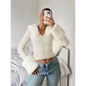 Trendy Women's Long Sleeve Knit Cardigan with Faux Fur Detail