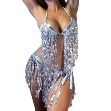 Show moreIntroducing the Women’s 3 Piece Sparkle Sequin Tassel Swimsuit, the ultimate festival outfit that effortlessly blends style and comfort! This eye-catching ensemble includes a chic crop top, cheeky bottoms, and a flirty mini skirt cover-up, all adorned with dazzling sequin tassels that are sure to turn heads. The combination of 82% polyester and 18% spandex ensures a soft, breathable, and skin-friendly fit, making it perfect for long days at the pool or dancing the night away at your favorite festival.