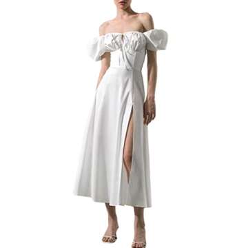 Women's Boho Dress Puff Short Sleeves Square Neck High Splitting Long Maxi Cottagecore Dresses White Small