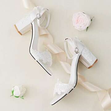 Women's Bridal Shoes Open Toe Comfortable Mid Block Heel Lace Satin Ankle Strap Wedding Dress Pump Sandals