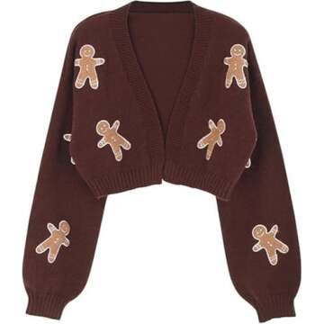 Women's Cartoon Print Drop Shoulder Cardigan, Gingerbread Sweater Women, Gingerbread Cardigan (US, Alpha, X-Large, Regular, Regular, Brown)