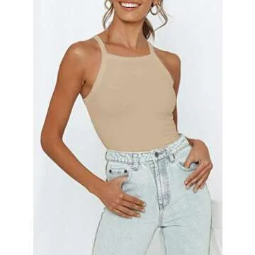 Women’s Casual Strappy Sleeveless Ribbed Knit Halter Neck Racerback Camisole Bodysuit Tank Tops