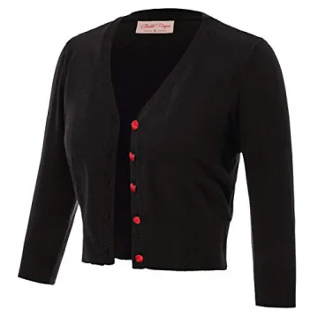 The cardigan is offered in several colors, including options with contrasting buttons to add a stylish touch.