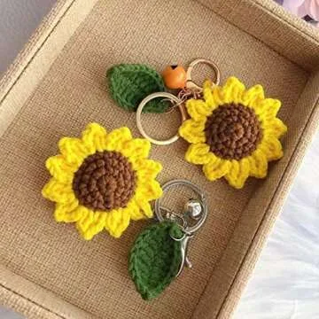 Women's Colorful Handmade Sunflower Key Chain Car Key Ring Pendant for Purse Ornament Handbag Bag, Earphone Case Decoration (Yellow Bell-Dark Green Leaf)