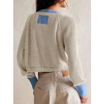 Women's Cropped Cardigan Sweaters Fall Long Sleeve Open Front Cardigans Button Down Color Block Crewneck Knit Outwear Coats Apricot