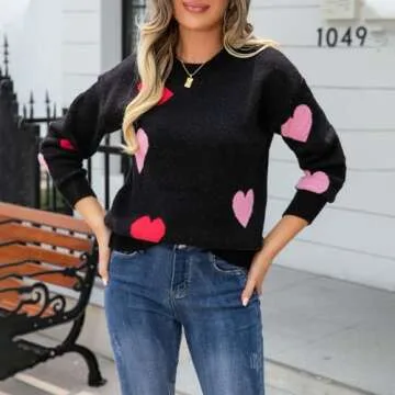 Women's Cute Heart Sweater Love Print Valentines Day Knitted Top Casual Crewneck Long Sleeve Sweaters Pullover