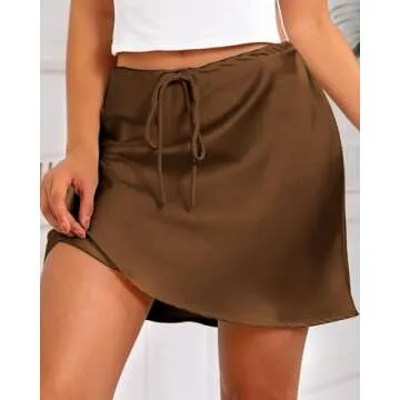 Women's Drawstring Satin Mini Skirt High Waisted Elegant Casual A-Line Flared Silk Short Skirts for Women Brown