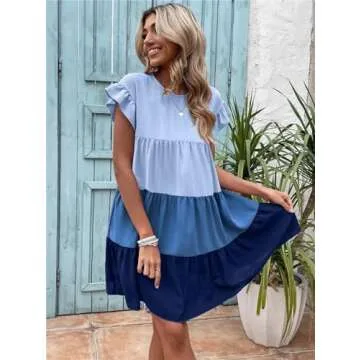 Women's Elegant Autumn Color Block Short Sleeve Round Neck Boho Striped Flowy A Line Short Dress(C07-Blue-M