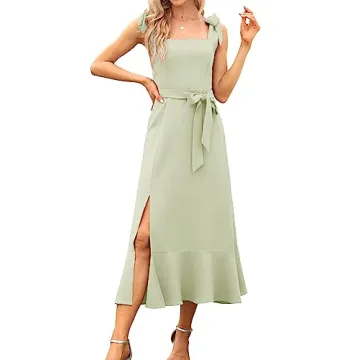 What truly sets this dress apart are its exquisite features designed for the modern woman. The detachable waist sash and versatile tie-up ribbon straps offer you the freedom to customize your aesthetic based on personal style or event theme. Whether you want to accentuate your waist with the sash or prefer a minimalist approach, this dress meets your every wish! The flowy ruffle hem midi skirt, adorned with a graceful side slit, adds an air of sophistication and ease to your movements—perfect for twirling on the dance floor.