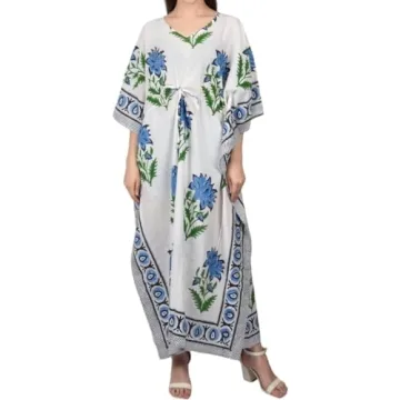 Women's Ethnic Hand Block Print Cotton Maxi Kaftan Dress - Floral Beach Wear