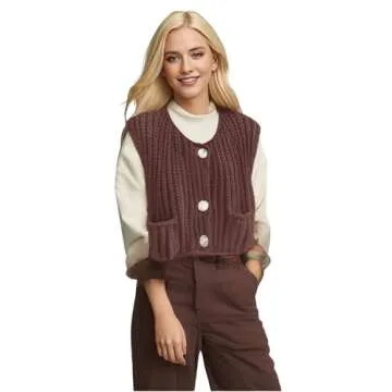 Women's Fashionable Sleeveless Short Knitted Sweater Vest Button Cardigan with Pockets(Brown,M)