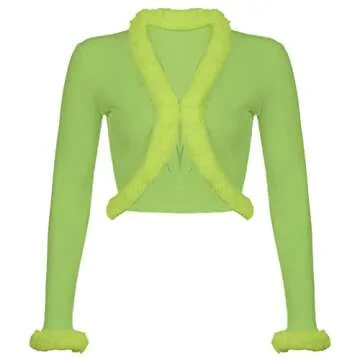 Women's Fluffy Long Sleeve V-Neck Cropped Knit Cardigan Sweater Solid Pullover Tops with Faux Fur Trim Collar Cuffs (K Green, L)