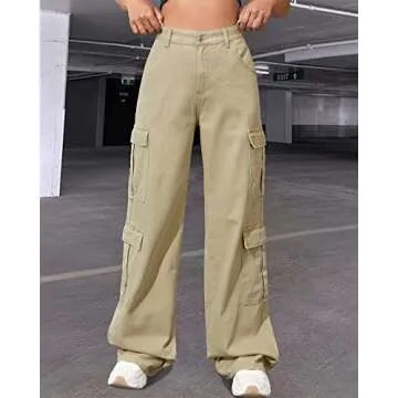 Women's High Waist Cargo Jeans Flap Pocket Baggy Cargo Pants Y2K Wide Leg Denim Jeans Straight Casual Loose Trousers Y2K Streetwear Pants-S Khaki.