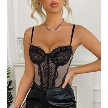 Women's Lace Mesh Bustier Fish Boned Sheer Spaghetti Straps Going Out Corset Crop Top with Underwire