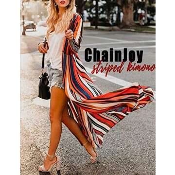 Show more Experience effortless style and elegance with our stunning striped long kimono cardigans for women offered by ChainJoy. Crafted from a lightweight blend of 95% polyester and 5% spandex, these sheer chiffon kimonos are designed for comfort, making them ideal for spring, summer, and autumn. The open front and long sleeve design allows for versatility, enabling you to easily dress it up or down for any occasion.