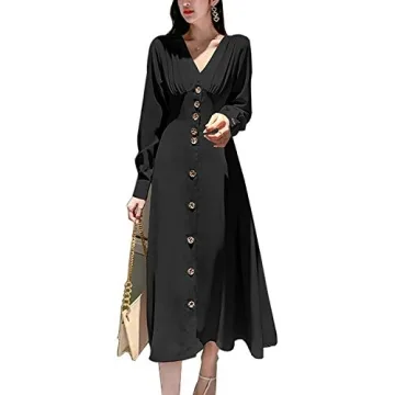 Women's Long Sleeve V Neck High Waist Button Down Skater Midi Dress (Small, Black)