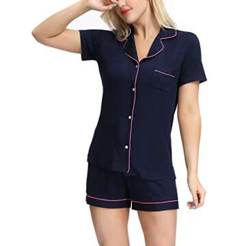 Women's Pajamas Short Set Loungewear Short Sleeve Sleepwear Button-Down PJS Set Navy L