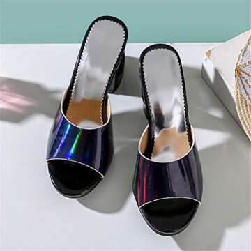 Women's Peep Toe Slide Sandals Cutout Chunky Block High Heel Comfortable Slip On Mules Pumps Shoes Black