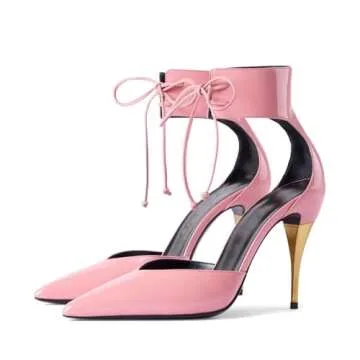 Women's Pink Stiletto Slingback Heels Closed Pointed Toe Golden High Heel Ankle Strap Lace Up with Bow Pumps Fashion Party Dress Shoes Ladies