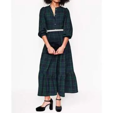 Show moreThis enchanting Women’s Plaid Maxi Dress is the ultimate holiday ensemble that brings festive glamour to your wardrobe! Crafted from soft, comfortable cotton, it features a stunning plaid print in luscious green tones that capture the essence of holiday cheer. With a chic round neckline and a partial hook and eye front closure, this dress elegantly combines style and practicality. The flowy tiered design gives it an effortless silhouette, perfect for twirling around at seasonal gatherings. A flattering tied waist cinches the look, adding definition and charm, making this dress not just a visual delight, but a comfortable option for any occasion.