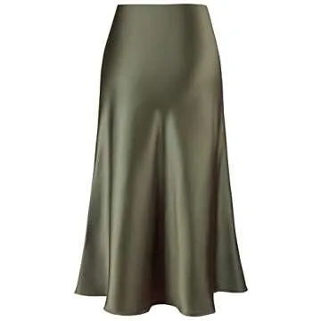 Women's Satin High Waist Hidden Elasticized Waistband Flared Casual A Line Midi Skirt (Army Green, XX-Large)