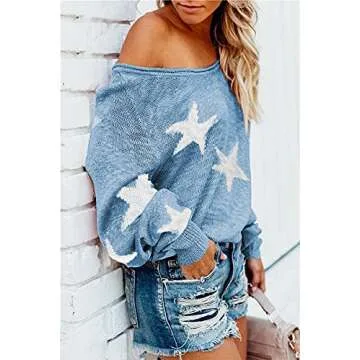 Women's Scoop Neck Long Sleeve Off The Shoulder Star Tops Pullover Sweater Blue S