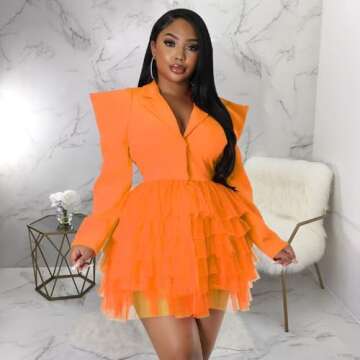 Women’s Semi Formal Mesh Puff Long Sleeve V Neck Dress Tulle A Line Business Mini Dress for Office Orange M