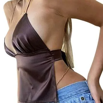 Introducing the Women's Sexy Deep V Neck Halter Crop Cami Top, the epitome of modern chic and effortless style. This stunning brown crop top is crafted from a lightweight polyester fabric, ensuring both comfort and versatility. Perfect for layering or wearing solo, it features a deep V-neck design that enhances your silhouette and exudes confidence. The self-tie knot at the back allows for a customizable fit, while the open back design adds a playful touch to your outfit. Whether you're dressing...