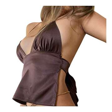 Show more Introducing our stylish Women Cute Crop Tops, designed for the fashionable woman who wants to make a statement! Crafted from 100% lightweight polyester, these crop tops provide not only comfort but also a trendy edge to any outfit. The unique self-tie knot open back adds a touch of delicacy, while the deep V neck enhances your silhouette, making it a must-have for your wardrobe.