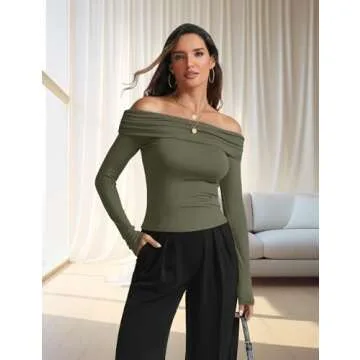 Women's Sexy Off Shoulder Tops Dressy Casual Slim Fit Long Sleeves Spring Fall Blouse Going Out Nightout Shirt Army Green