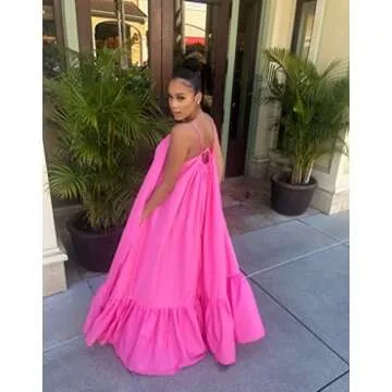Women's Sexy Spaghetti Strap Sleeveless Ruched Ruffle Hem Bandage Oversized Beach Loose Long Maxi Swing Dress Pink L